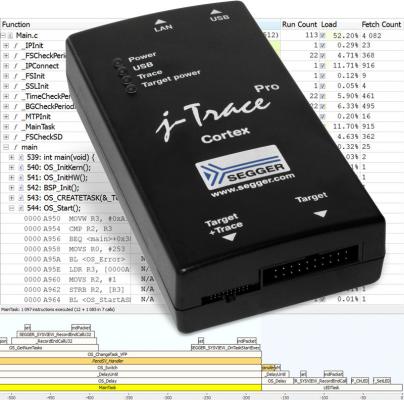 J-Trace PRO Cortexは、組み込みアプリケーション用の完全な機能を備えたグラフィカルなデバッグ/パフォーマンスアナライザであるOzoneを使用します。Ozoneは、SEGGER Embedded Studio、Eclipse/GCC、IAR Embedded Workbench、Keil/ARM MDKなどのEABI準拠のツールで作成されたELFファイルを使用して、ソースレベルでデバッグおよび分析することができる高度なプロフェッショナルデバッグ・検証アプリケーションです。Ozoneは、J-Trace PRO Cortexのストリーミングトレース技術と組み合わせて、リアルタイムコードプロファイリングとリアルタイムコードカバレッジを提供します。Cortex-Mターゲットハードウェアが同梱されているため、新しいトレースプローブを使用して稼動するまでには15分もかからず、ELFファイルとEmbedded Studio用プロジェクトがすぐに利用できます。