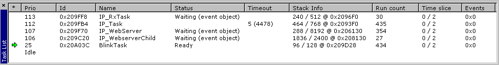 タスクリストはembOSにある全てのタスクの情報を表示しています。緑の矢印は実行中のタスクを指し示します。